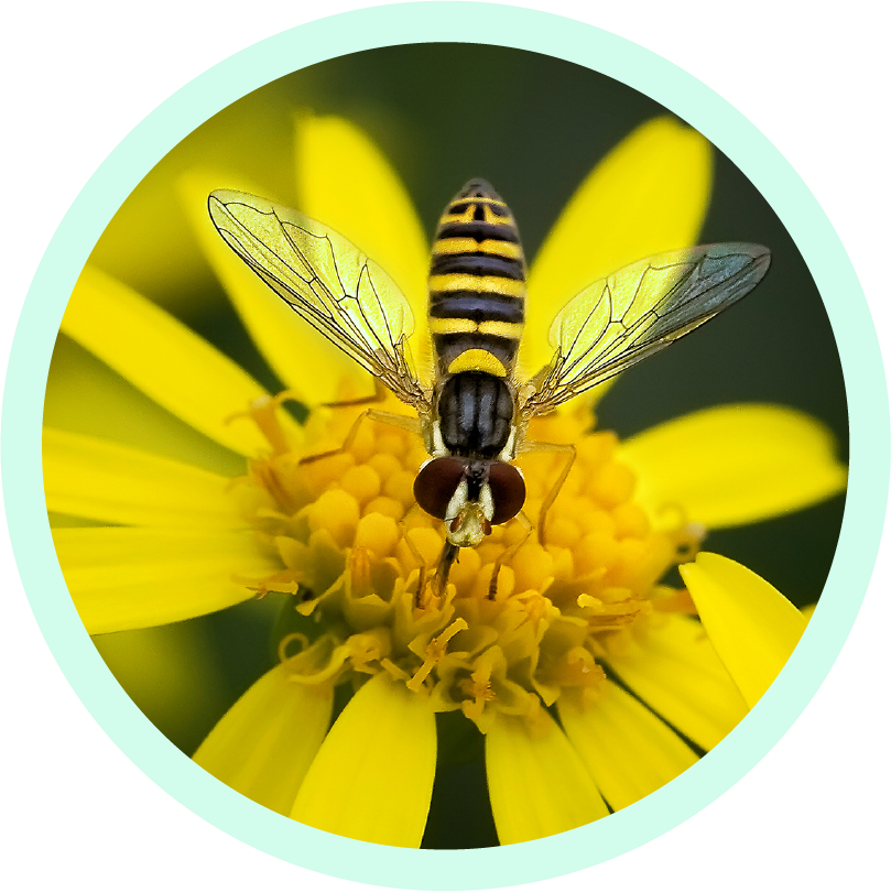 Le Syrphe, souvent confondu avec une abeille en raison de sa ressemblance, est en réalité une mouche bénéfique qui aide à polliniser les fleurs et à contrôler les populations de pucerons