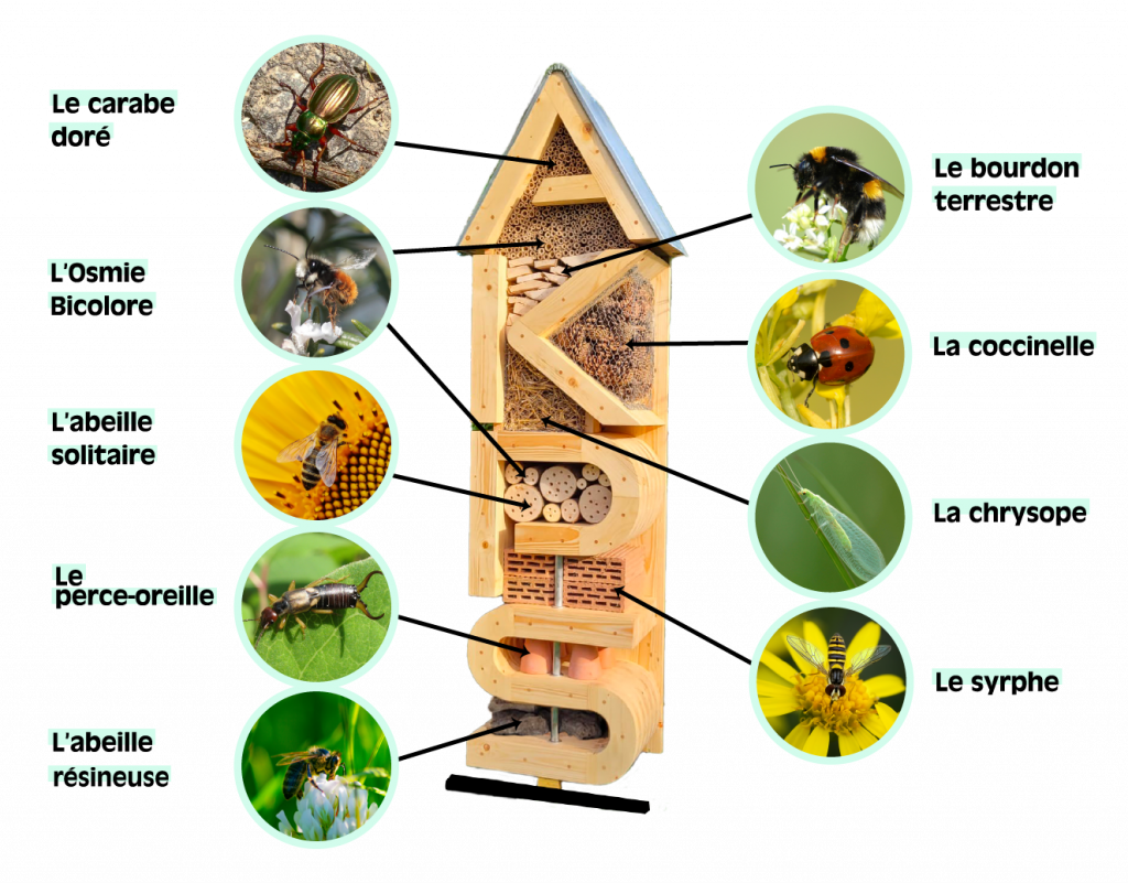 L’hôtel à insectes est composé de divers matériaux, choisis spécifiquement pour attirer et accueillir des variétés d’insectes bénéfiques à nos parcs et jardins. Découvrons ensemble ses habitants !